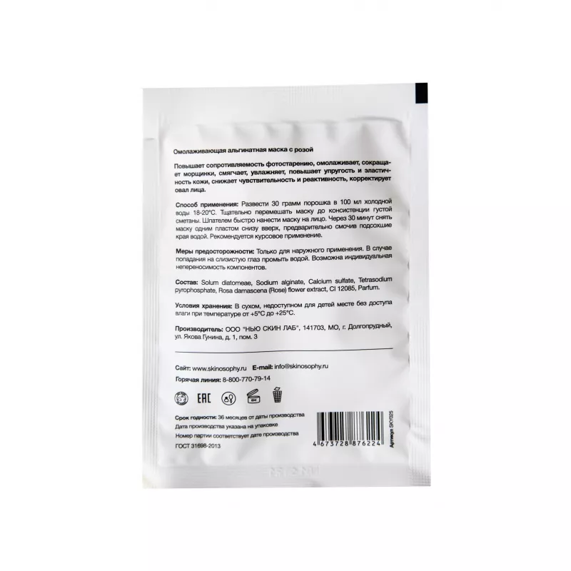 Омолаживающая альгинатная маска с розой повышает сопротивляемость фотостарению, омолаживает, сокращает морщинки, смягчает, увлажняет, повышает упругость и эластичность кожи, снижает чувствительность и реактивность, корректирует овал лица. Рекомендуется курсовое применение.
