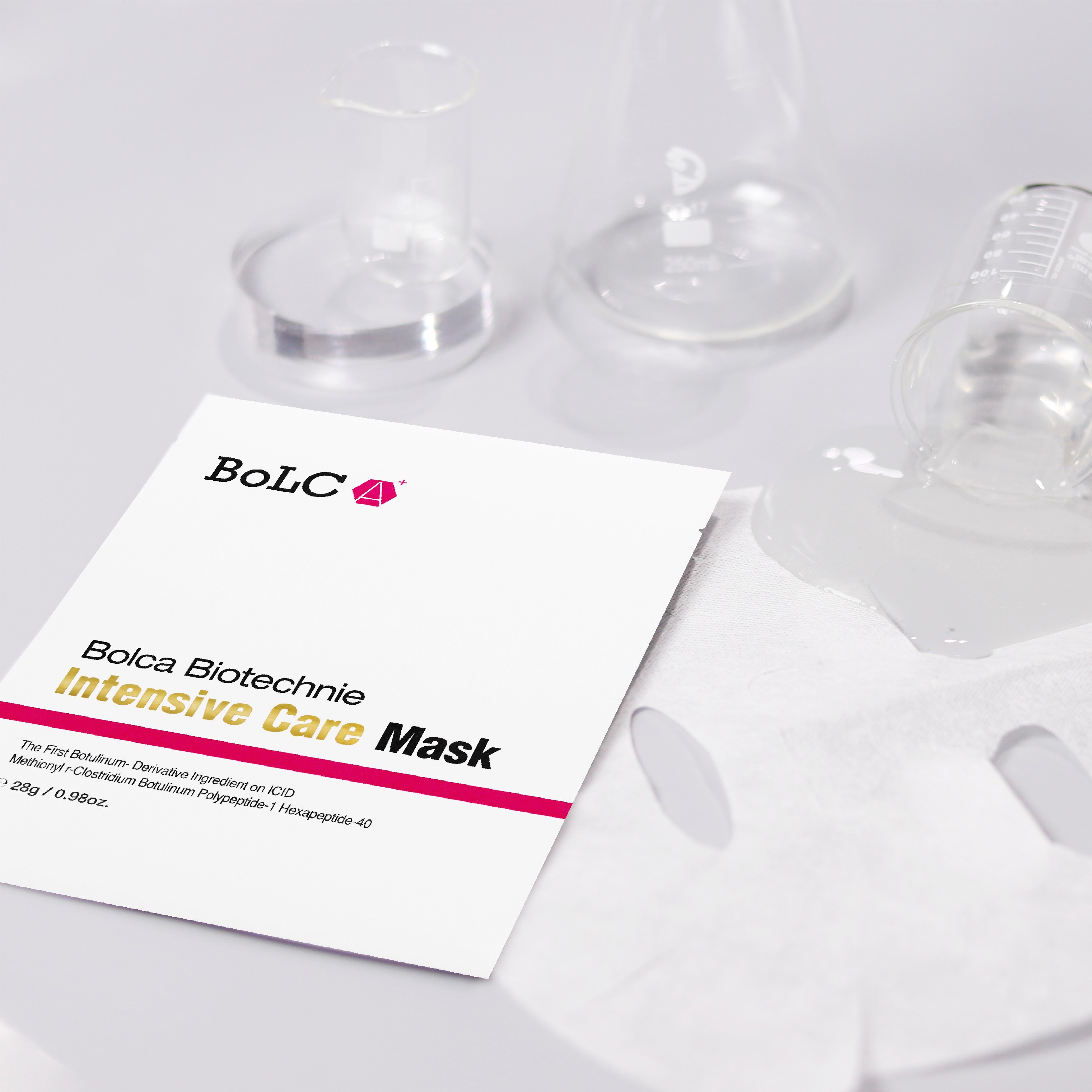Интенсивная маска от морщин BolCA Biotechnie Intensive Care Mask имеет богатейший состав, включающий 15 аминокислот, пептиды и натуральные экстракты. Эффективно устраняет морщины, складки, делает кожу упругой и эластичной, осветляет и выравнивает тон кожи, уменьшает поры. Проникновение активных ингредиентов в глубокие слои кожи обеспечивается эффектом окклюзии. В маске использована целлюлозно-альгинатная основа: «ткань» из нанофибрилл целлюлозы, покрытая альгиантом кальция (технология CupraТМ, Япония). Маска может находиться на лице до 50 минут, плотно прилегая, не высыхая и не стягивая кожу. Благодаря целлюлозно-альгинатной матрице и ее влиянию на проницаемость рогового слоя, активные вещества, содержащиеся в маске, успешно проникают до своих мишеней в коже и воздействуют на них.