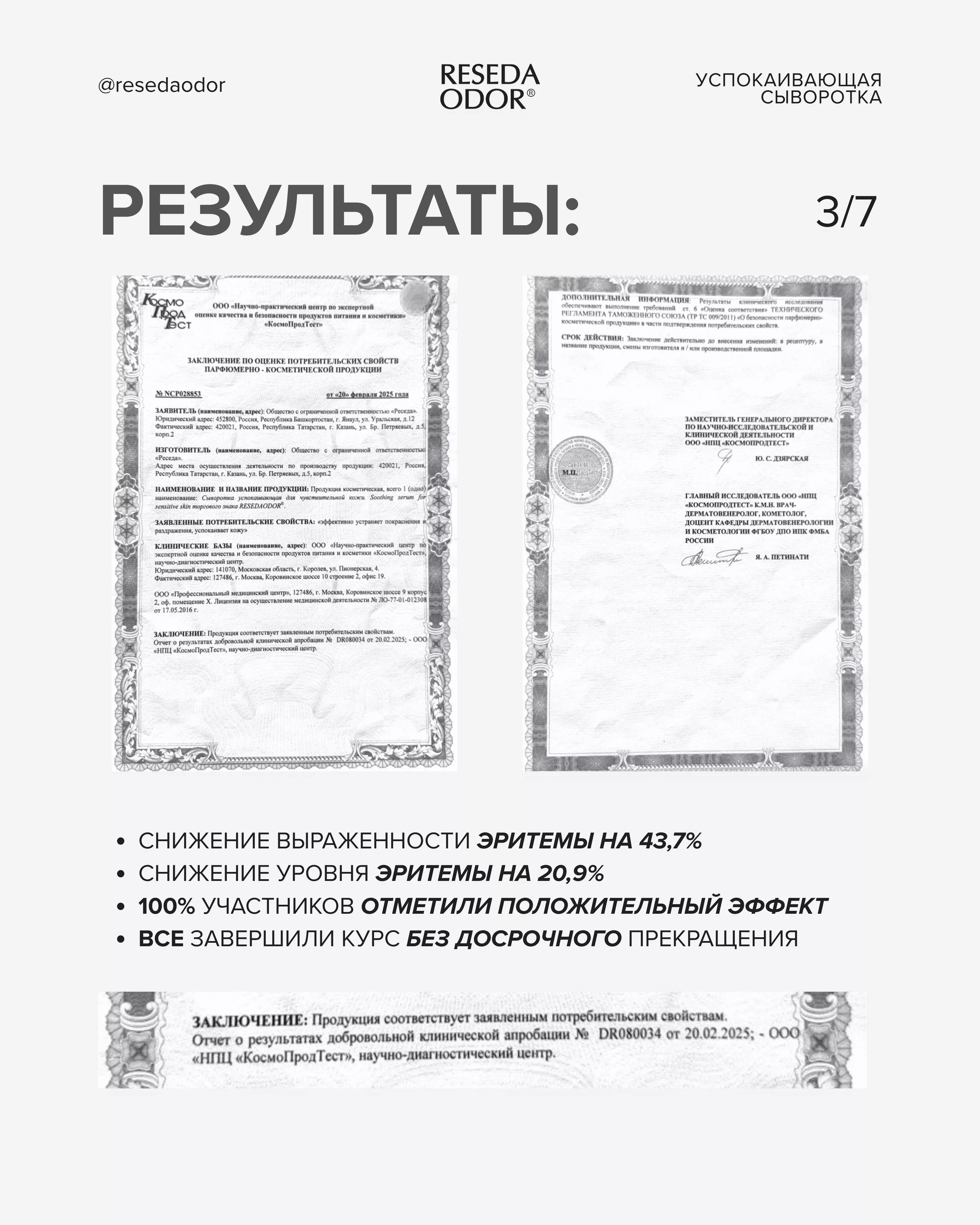 *Заключение по оценке потребительских свойств парфюмерно –косметической продукции выданный ООО «Научно-практический центр по экспертной оценке качества и безопасности продуктов питания и косметики «КосмоПродТест» № NCP 028853от 20.02.2025