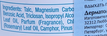 Специальная пудра – адсорбент влаги (пота) с дезинфицирующими ингредиентами. Она помогает содержать ноги сухими, смягчает кожу. Камфора и оксид цинка предотвращает появление запаха и грибковые инфекции. Пудра придает ощущение бархатности и нежности кожи. Триклозан в составе пудры оказывает противогрибковое действие.