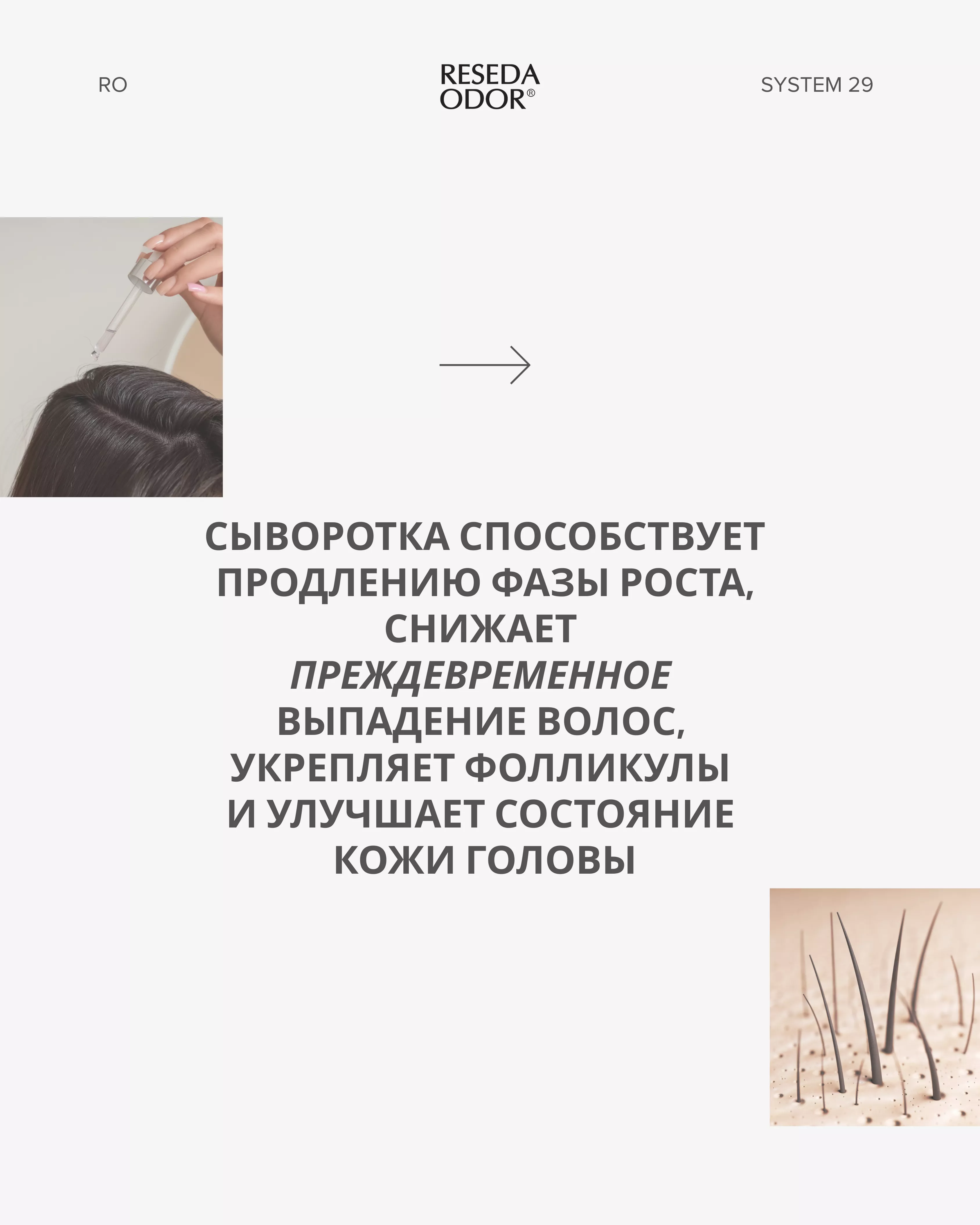 При регулярном применении сыворотка способствует стабилизации цикла роста волос, уменьшению их выпадения и восстановлению благоприятной среды для полноценной работы фолликулов и поддержания баланса микробиома кожи головы.